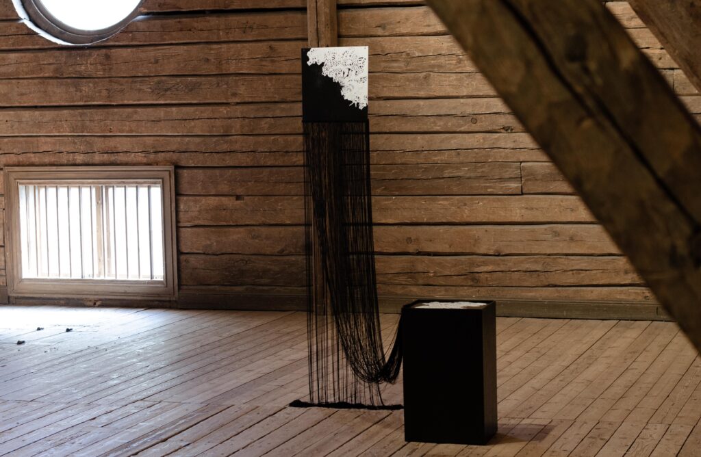 Handens arbete är långsamt och processen tålamodskrävande. Från början är materialet tomt, utan berättelse. En tråd, ett ark, en pärla. En tunn linje i tusch eller ett sidentyg. Hon böjer stort, tecknar smått, tvinnar, flätar, limmar. Rör sig dynamiskt över ytor och arbetar på flera saker samtidigt. Bygger genom att sätta samman och stärka upp. Hennes kropp och hjärna har blivit som en kapsel och materialbank för de upptäckter hon gjort genom åren.